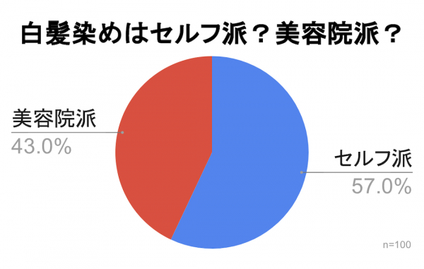 「白髪染めはセルフ派ですか?美容院派ですか?」のアンケート調査を行ったところ、57%と約6割の人がセルフ派と回答し、セルフ派が美容院派を上回りました。