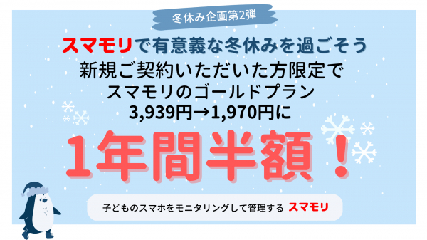 この度、2022年12月28日(水)より、株式会社JIRAN JAPAN(本社:東京都港区、代表取締役:呉治泳)は、お子様のスマートフォン使用管理アプリ「スマモリ」の冬休み限定、ゴールドプランの年契約の1年間半額キャンペーンを実施することになりました。