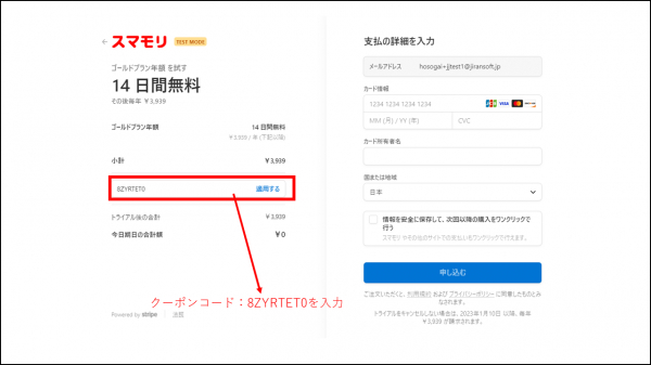 3, 左側にクーポンコード、右側のカード情報を入力して申し込みをすると完了です。