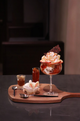 新発売となる『林檎と日向夏のパフェ ~雪うさぎ~』は、タルトタタンのようにキャラメルで煮込んだ林檎に、紅茶のゼリーで華やかな香りを織り混ぜ、林檎(フレッシュ)と日向夏の酸味と香りが全体を引き締める味わいになっています。酸味・苦味・甘味の調和の取れた味に仕上がりました。