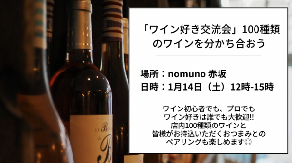 株式会社ノムノ(本社:東京都港区 代表取締役社長:蔵石 周太)が運営するワインバーnomuno赤坂店で「ワイン好き」が集まる交流イベントを開催いたします!