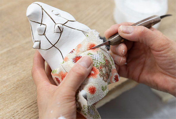 「木目込み」という名は、衣裳のひだや布切れの境となる部分に細い溝を彫り込み、そこに布を「きめこむ」ことから生まれています。「きめこむ」とはもともと「極めこむ」と書き、「中に入るものが、入れ物に隙間なく、うまく合うように入れる」という意味があります。