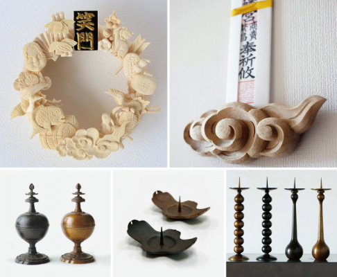今回は多くの「祈り」のカタチから、お正月にふさわしい手彫りのお飾りや、井波彫刻や高岡銅器など、それぞれの産地と一緒に製作したさまざまなスタイルの「祈り」のカタチが届きました。