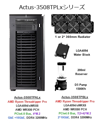 Acutus-3508TPLxシリーズは、毎時排出量1500の高性能D5ポンプと、1基または2基の360mmラジエーターにより、オーバークロック動作のAMD Zen2 / Zen3マイクロアーキテクチャーをベースとしたLGA-4094ソケット(ソケットsWRX8/SP3r4)Ryzen Threadripper Pro CPUと、4基までのGPUが水冷化できる、大冷却容量水冷システムを搭載したワークステーションです。