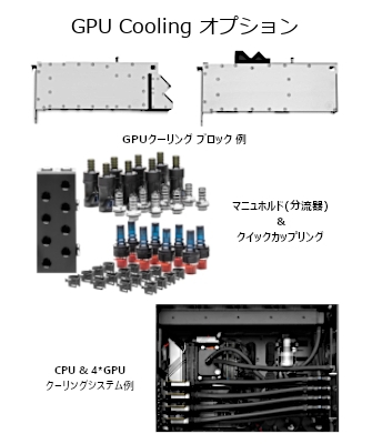 工業デザイン、科学研究分野でのビジュアルコンピューティング用プラットフォームとして、NVIDIA RTX、T、QuadroシリーズGPUの搭載、NVIDIA SLIによるRTX/RTX-A/Quadro/Quadro RTXマルチ水冷式GPU環境の利用が可能です。(3)