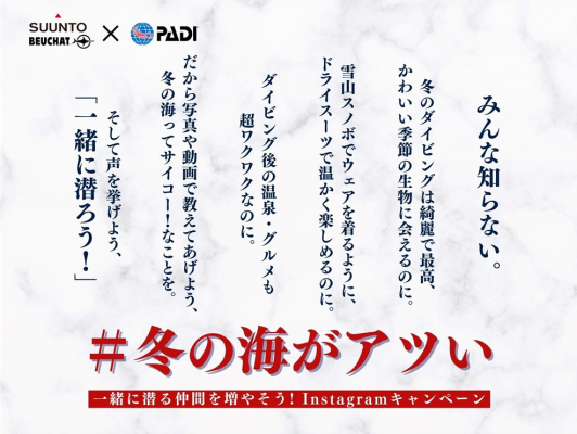 スクーバダイビングの教育機関であるPADI(株式会社パディ・アジア・パシフィック・ジャパン、本社:東京都中央区 代表取締役会長:中野龍男)は、冬のダイビングの魅力が伝わる写真・動画を募集する「#冬の海がアツい」キャンペーンを2023年1月1日(日)よりInstagramにてスタートしました。キャンペーン期間は2023年3月31日(金)まで。毎月抽選で、ダイブコンピュータやPADIオリジナルグッズなどが贈られます。