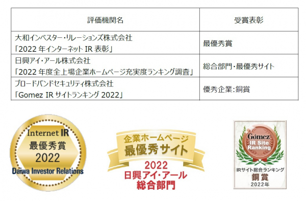 ●大和インベスター・リレーションズ(株) 「2022年インターネットIR表彰」 最優秀賞(受賞日 2022年12月8日)