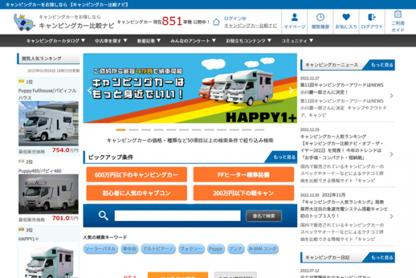 国内で販売されているキャンピングカーのスペックやオーナーなどによるクチコミ評価を比較できる情報サイト「キャンピングカー比較ナビ」を運営するキャンピングカー株式会社(本社:東京都渋谷区、代表取締役:頼定 誠)は2023年1月5日、「キャンピングカー比較ナビ」内で人気のあるキャンピングカーの閲覧数ランキングを発表いたしましたので、お知らせいたします。