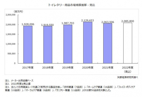 株式会社矢野経済研究所(代表取締役社長:水越孝)は、国内のトイレタリー用品、主要50品目の市場を調査し、市場規模や品目別動向、参入企業動向、将来展望を明らかにした。