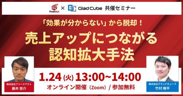 株式会社グラッドキューブ(本社:大阪市中央区 代表取締役 CEO 金島 弘樹 以下:グラッドキューブ)は、株式会社フリークアウト(本社:東京都港区 代表:時吉 啓司)と共催で、1月24日(火) 13:00~ 売上アップにつながる認知拡大手法をテーマにオンラインセミナーを開催いたします。