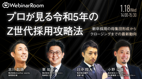 ビジネスマンの役に立つ動画がいつでも無料で観られるウェビナープラットフォーム「Webinar Room(ウェビナールーム)」(https://webinar-room.net/)を運営する株式会社ヒトクセは、2023年1月18日(水)14:00~に株式会社Another works、株式会社テックオーシャン、株式会社識学、株式会社エイムソウルとの” プロが見る令和5年のZ世代採用攻略法~新卒採用の母集団形成からクロージングまでの最新動向~”を開催します。
