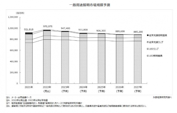 2022年の一般用途照明市場(従来光源照明器具+従来光源ランプ+LED照明器具+LEDランプを合算)は前年比5.2%増の9,701億円を見込む。また、2023年の同市場規模は同2.3%減の9,474億円、2027年は2022年比8.7%減の8,852億円になると予測する。