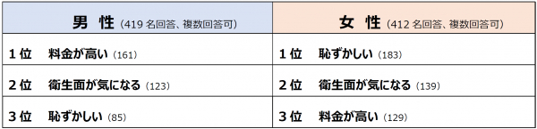 外出先でマッサージチェアを利用したことがない方にその理由を聞いたところ、「恥ずかしい」「衛生面が気になる」「料金が高い」の3点に回答が集まりました。中でも女性では4割以上の方がその理由として「恥ずかしい」をあげており、男性でも3割弱が同様に感じていました。パブリックな空間に置かれている事が多いため、人目を気にして使用できないという方が一定程度いることがわかりました。また、男女ともに2位は、不特定多数の方が使用することから「衛生面」を挙げていました。また、男性で10%、女性で5%が「そもそもマッサージが好きではない」と答えており、ここでも男女のマッサージチェアへの意識の違いが見られました。