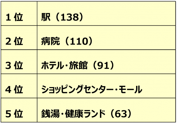 ●「あったら便利だと思う場所」、広く普及しているホテルや銭湯を押さえ、駅が1位に。