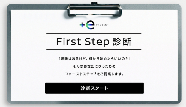 「+e PROJECT」の第一弾の目玉となるのが3月4日から積水ハウスの協力のもと日産がスタートする「+e試住」。EVのある暮らしの利便性を気軽に体験いただく機会をご提供します。また、現在集合住宅で暮らす方に向け、集合住宅へのEV充電設備導入方法をよりわかりやすくステップでまとめた特設サイトも本日1月12日より公開。EVと暮らしにかかわるニュースや体験者の声などを定期的に配信するほか、「興味はあるけど、何から始めたらいいの?」という方のための『First Step診断』も設けました。診断結果の中には充電サービス業者であるENECHANGE株式会社、Terra Motors株式会社、ユアスタンド株式会社、ユビ電株式会社を紹介するページも用意。設問に答えていくとEV導入に向け、「初めの一歩」に何をしたら良いかが具体的に分かる仕様となっています。