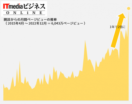 アイティメディア株式会社(本社:東京都千代田区、代表取締役社長:大槻利樹 以下、アイティメディア)は、ビジネス情報サイト「ITmedia ビジネスオンライン(https://www.itmedia.co.jp/business/)」が2022年12月実績において、前年同月比で約2倍となる過去最高月間6,000万ページビューを超えたことを発表します。