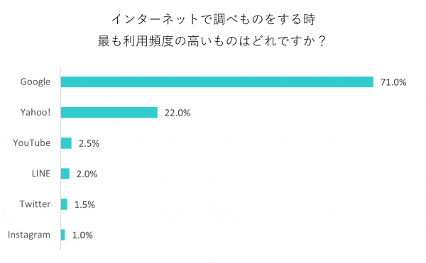 「Google」と答えた人が71%となり、次いで「Yahoo!」22%、「YouTube」2.5%、「LINE」2%、「Twitter」1.5%、「Instagram」1%という順になりました。