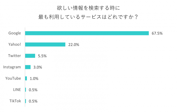 「Google」67.5%、「Yahoo!」22%、「Twitter」5.5%、「Instagram」3%、「YouTube」1%、「LINE」0.5%、