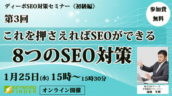SEO対策サービスの開発・販売を行っている株式会社ディーボ(札幌市、代表取締役社長:藤沢 竜志、以下:ディーボ)は、2023年1月25日(水)15時から第3回目となるSEO対策セミナー《初級編》を開催します。