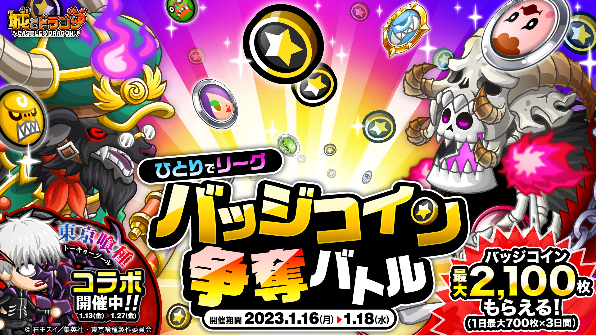 上記期間中“ひとりで”リーグに参加してバトルに勝利すると、報酬として1日5回まで“バッジコイン”が贈られます。1勝につき50枚、5勝目には500枚のバッジコインを必ず獲得できます。
