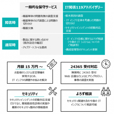 一般的な保守サービスでは対応していない、ITインフラ全体を考慮した根本原因の調査、問題切り分け、セキュリティインシデントの初動対応支援、よろず相談等を行う技術支援サービスです。