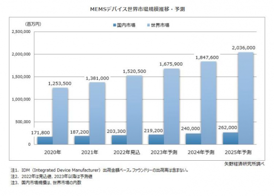 MEMSデバイスの製造は、半導体製造と同様に自社で設計・製造・販売まで行う垂直統合型メーカーであるIDM(Integrated Device Manufacturer)と受託製造に特化した企業であるファウンドリーに大きく分けられる。ファウンドリーを除くIDMを対象とした、2022年のMEMSデバイス世界市場規模(メーカー出荷金額ベース)は1兆5,205億円の見込みである。