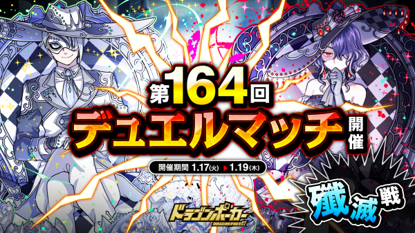 株式会社アソビズム(本社:東京都千代田区、代表取締役:大手智之)は、App Store・Google Playにて好評配信中のリアルタイム合体カードバトル『ドラゴンポーカー』で、2023年1月17日(火)より「第164回デュエルマッチ本戦」を開催いたします。