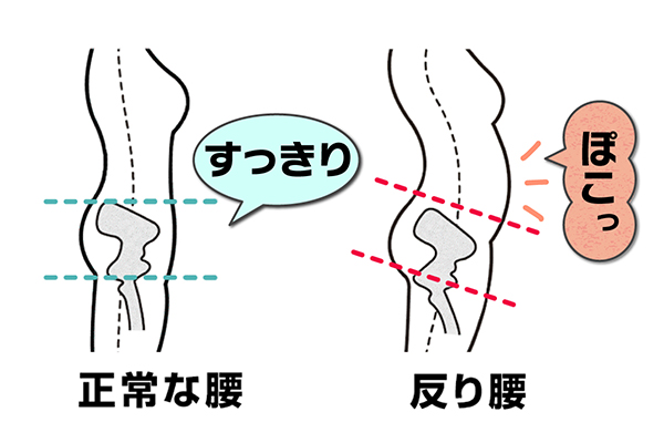 正常な腰の位置は骨盤がまっすぐですが、姿勢の悪さや筋力低下、腸腰筋などの筋肉のコリ、日常生活で体に負担がかかり骨盤の位置が下がると反り腰になり、腰やお腹に負担を感じるようになります。それが原因で、下腹がポッコリと出てしまったり、気づかないうちに隠れ反り腰になっている方も少なくはありません。