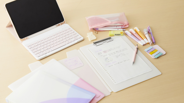 本製品は、そうした学習方法に対応し、クリップボードに表紙を付けた「クリップファイル」を開発。さらに表紙外側にポケットを付けることで、授業で使うプリントやルーズリーフを一時保管しやすく持ち歩きが便利な機能を加え、かわいらしいパステルカラーで勉強がより楽しくなることを目指しました。