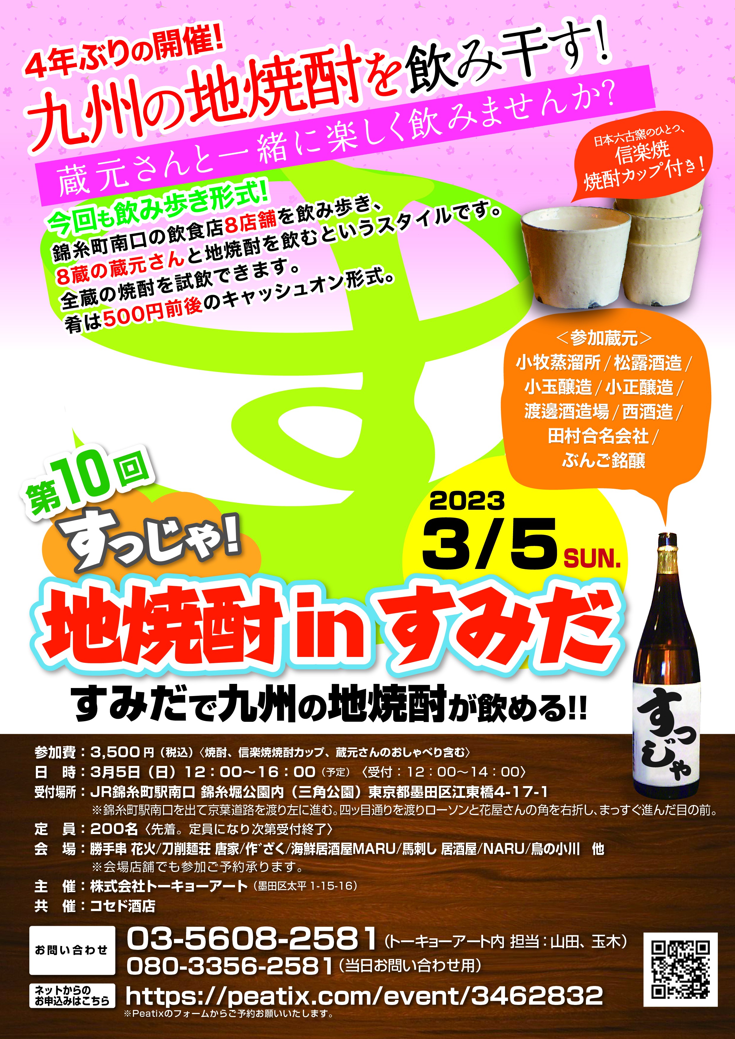 墨田区の印刷会社、(株)トーキョーアート(2020年1月1日より社名変更)は、3月5日(日)焼酎イベント「第10回すっじゃ地焼酎inすみだ」を、4年ぶりに開催します。