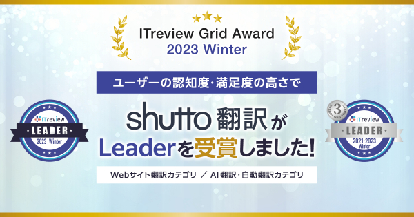 この度、Webサイト翻訳ツール「shutto翻訳」は、アイティクラウド社主催の「ITreview Grid Award 2023 Winter」において、【認知度】【満足度】ともにユーザーから高い評価を受け、Webサイト翻訳カテゴリー、AI翻訳・自動翻訳(テキスト翻訳)ツールカテゴリーの2カテゴリーで、アワード「Leader」を受賞しました!Webサイト翻訳カテゴリーについては、16期連続の受賞となります!