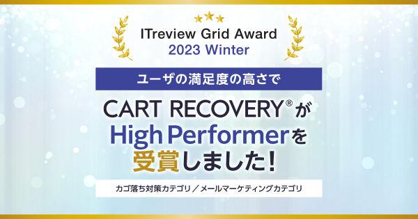 この度「CART RECOVERY(R)」は、アイティクラウド社主催の「ITreview Grid Award 2023 Winter」において、【満足度】においてユーザーから高い評価を受け、カゴ落ち対策カテゴリーのアワード「High Performer」を受賞しました!また今回、メールマーケティングカテゴリーでも「High Pergomer」を受賞いたしました!