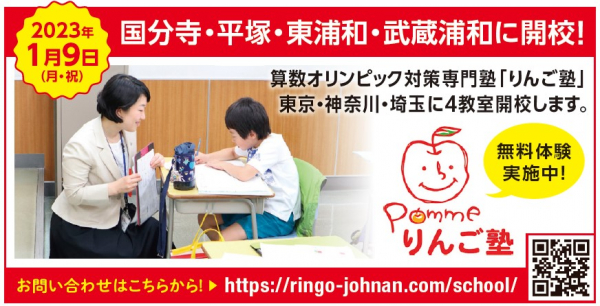 「りんご塾」は、算数オリンピックでの入賞を目標に掲げる、算数に特化した塾です。当社は、2018年に自由が丘校の運営を開始以来、入塾待ちが出る塾として東京・神奈川・千葉・埼玉エリアに展開。今回の国分寺・平塚・武蔵浦和・東浦和の開校により、全32校となります。
