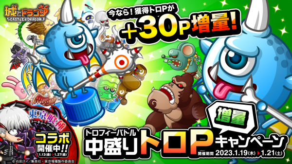株式会社アソビズム(本社:東京都千代田区、代表取締役:大手智之)は、App Store・Google Playにて好評配信中の『城とドラゴン』で、「トロフィーバトル 中盛りトロP増量キャンペーン」を2023年1月19日(木)より開催いたします。