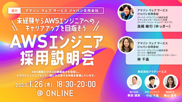 アマゾン ウェブ サービス(以下:AWS)のAWS アドバンストティア サービスパートナーである株式会社アイディーエス(本社:東京都港区、代表取締役:中野 貴志、以下アイディーエス)は、1月26日(木) にAWS社協力のもと「未経験からAWSエンジニアを目指そう!AWSエンジニア採用説明会」を開催いたします。