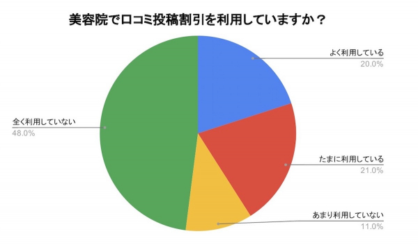 「美容院で口コミ投稿割引を利用していますか?」の質問では、『よく利用している』が20%、『たまに利用している』が21%、『あまり利用しない』が11%、『全く利用しない』が48%、という結果となり、半数近くの人は口コミ投稿割引を利用しないことがわかりました。