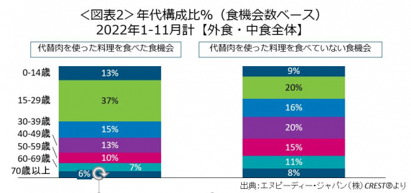 2022年1-11月の食機会数の年代構成比をみると(図表2)、代替肉を使った料理を含む食機会では、15-29歳の若年層の構成比が最も高く、37%を占めました。代替肉を使った料理を食べていない食機会では、同年代の構成比は20%と、17ポイントもの差がありました。