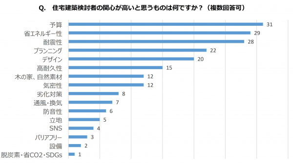 ■住宅建築検討者、関心が高いと思われるのは1位「予算」、2位「省エネ性」