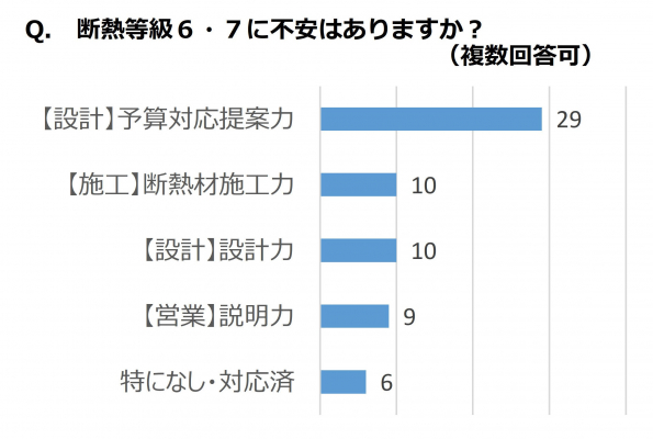昨年スタートした断熱等級6・7について「建築事業者が不安に感じること」については、「予算対応提案力」が過半数の声を集め、2位以下を大きく離す結果となりました。