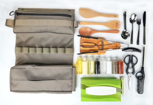 ナイフ、おたま、菜箸、ターナー、ピーラー、トング、カトラリー、計量スプーン、オープナー、BBQ串などの料理に必要なキッチングッズの収納はもちろんですが、お好みの液体調味料やシーズニングを付属のボトルに詰め替えて、大きさと形状を統一することでかさばらずに収納できます。また、ティッシュBOXやカッティングボードといった大きめサイズのグッズも収納可能です。これ一つで、キャンプ料理がより楽しく時短にもつながります。コンパクトに折りたためて持ち運びも簡単です。まるで“キャンプ料理の為の持ち運ぶキッチン”のような収納バッグです。