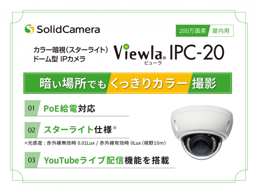 ソリッド株式会社(本社:大阪府大阪市、代表取締役社長:徳岡 太郎)はViewla(ビューラ)シリーズのカラー暗視ドーム型 IPカメラ「IPC-20」を2023年1月16日(月)に販売開始しました。