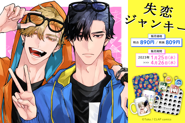 親友の「龍次郎」にこっそり片想いをしている「彗太」は彼の面影を追い求め、今日もノンケに恋をする。毎回上手くいかずに終わってしまうが、失恋の傷を癒やしてくれるのもまた龍次郎。長年拗らせた両片想いを笑いあり涙ありで描く「失恋ジャンキー」が販売開始となります。S賞アクリルブロックは鷹先生の描き下ろしイラストを使用!A賞~D賞は鷹先生たってのご要望で作中に登場するデフォルメイラストをふんだんに使用したデザインで、D賞のアクリルキーホルダーは2人のTシャツ部分が透過されているため好きなようにお楽しみいただけます!!ポップなカラーテイストとデザインで全て集めたくなること間違いなし!是非この機会をお見逃しなく!!