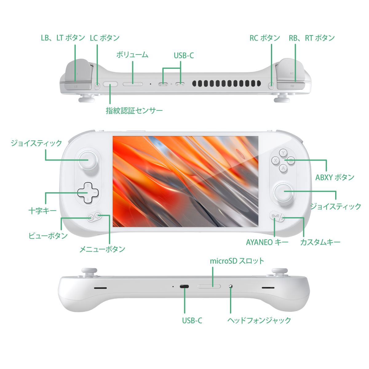USB-C端子に加えて2つのUSB4端子を搭載し、外部ディスプレイのほか様々な周辺機器を接続できます。操作性の高いジョイスティックや十字キーなどのゲームパッド部分に加え、本体上部に指紋認証センサーを搭載し、ワンタッチで手軽かつ安全にログインすることができます。また、本体下部にシステム操作に便利な専用キーを搭載、3つのカスタムキーは専用アプリ「AYASPACE」を用いて各種操作割り当てに対応し、Windows上やゲーム中の操作性を向上します。