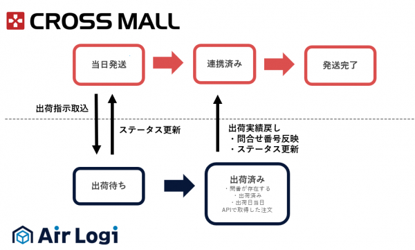 →Airlogiで入庫が行われたデータを差分でクロスモールに連携します。