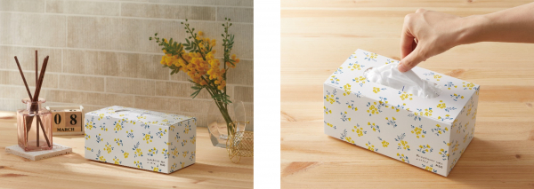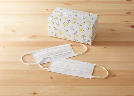 新しい生活様式のなか、マスクを購入後、取り出しやすさや生活空間を配慮し、専用ケースに詰替える機会が多いことが分かりました。本製品はそうした面倒な詰め替え作業が不要になるように、空間に調和し華やかで明るい印象を与える黄色い花柄のデザインをパッケージに施しました。さらに天面にはマスクをさっと取り出せる工夫を加え、煩わしいマスクの管理が快適になります。リビング・玄関など家族が手にとりやすい場所に置いて、毎日気持ちよくお使いいただけます。50枚入りで、オープン価格です。