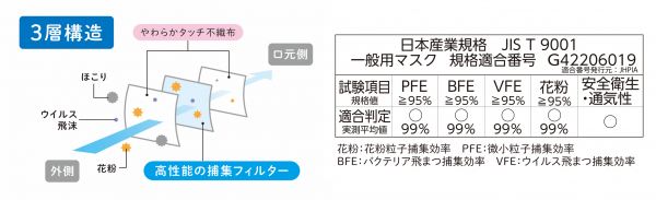 ウイルス飛沫・ほこり・花粉などの侵入を抑制する高性能の捕集フィルターを採用。厚生労働省と経済産業省が制定した日本産業規格「JIS T 9001」適合審査を経て、日本衛生材料工業連合会より一般用マスク区分で適合番号を取得しました。高品質マスクが快適と安心をお届けします。