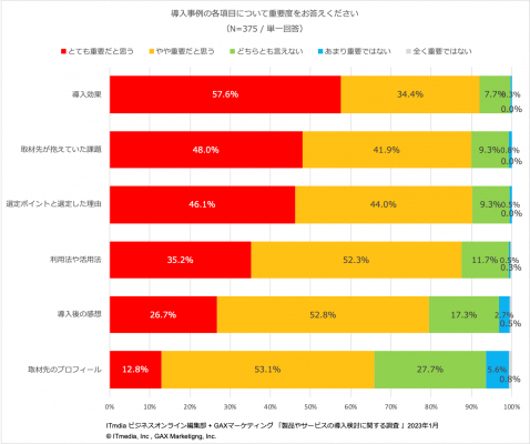 アイティメディアの読者調査によると、導入事例は、製品・サービスの導入検討の「稟議申請」段階で最も参考にされていました。導入事例では、顧客が抱えていた課題の内容、解決策の模索、比較検討と評価選定、導入後の感想などが顧客自身の肉声による一人称で語られます。そのため、その導入事例を読む買い手の立場として共感しやすく、高い納得感を得やすいコンテンツです。