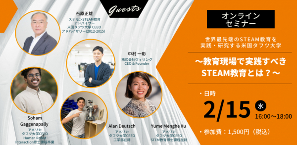 本セミナーでは、世界最先端の実践型STEAM教育を行うアメリカのタフツ大学CEEO(Center for Engineering Education and Outreach)のメンバーを迎え、日米の教育環境の比較から、現代の教育課題に対するSTEAM教育の高い有効性、日本の教育現場でSTEAM教育を促進するために必要なことを明らかにします。