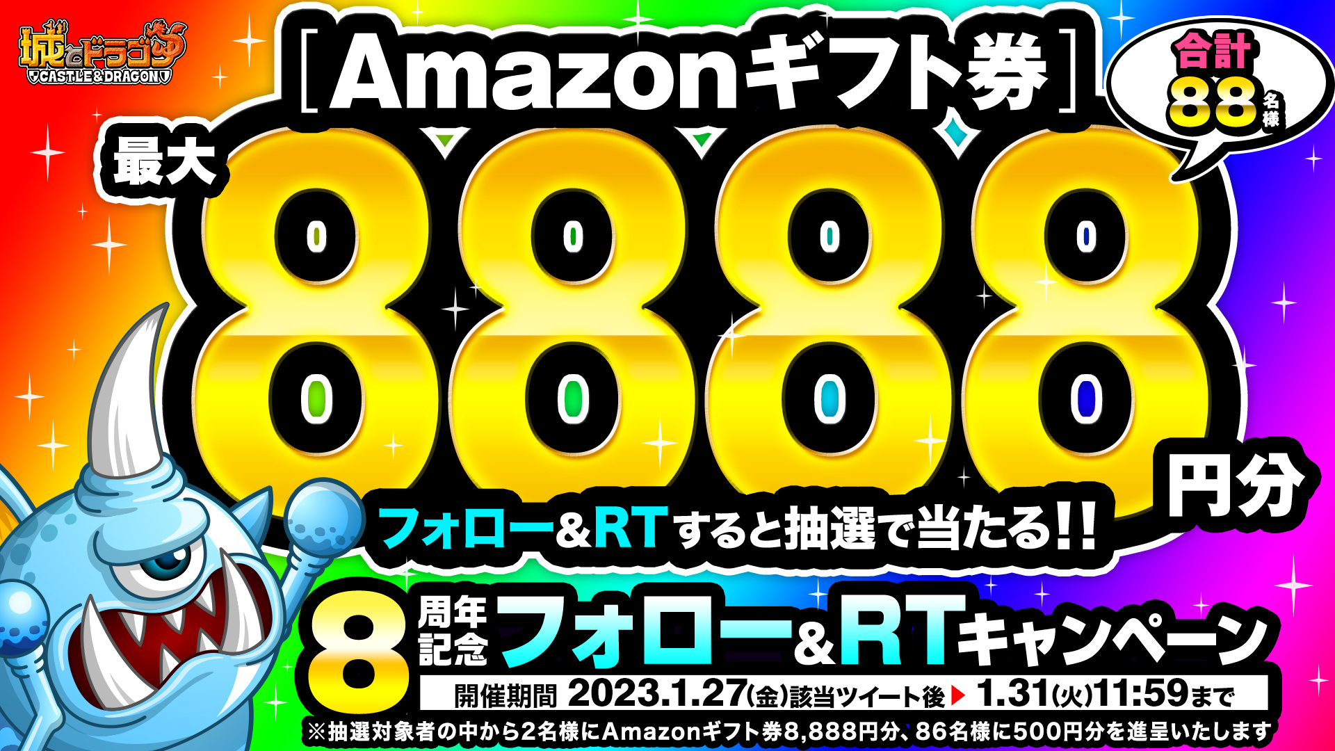 2023年1月27日(金)より、「8周年記念フォロー&RTキャンペーン」が開催中です。『城とドラゴン』公式Twitterアカウントをフォローし、対象ツイートをリツイートしていただいた方の中から抽選で、Amazonギフト券8,888円分を2名様、500円分を86名様にプレゼント!奮ってご参加ください!