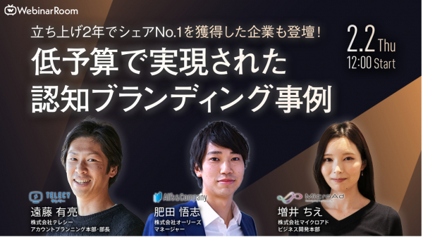 ビジネスマンの役に立つ動画がいつでも無料で観られるウェビナープラットフォーム「Webinar Room(ウェビナールーム)」(https://webinar-room.net/)を運営する株式会社ヒトクセは、2023年2月2日(木)12:00~に株式会社オーリーズ、株式会社マイクロアド、株式会社テレシーとの“ ~立ち上げ2年でシェアNo.1を獲得した企業も登壇!~低予算で実現された認知ブランディング事例”をテーマに共催ウェビナーを開催します。